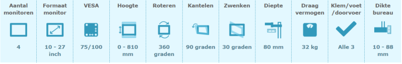 Ondanks dat hij 4 monitoren kan dragen, boet hij niet in op vermogen. Ook deze Neomount kan schermen tot 27 inch dragen. Dat is een diameter van wel 69 cm. Op elke arm is tot 8 kilogram aan scherm te bevestigen. De monitoren kunnen onafhankelijk van elkaar kantelen, zwenken en roteren. Daarmee kun je de ideale kijkhoek vinden. De bovenste monitoren zullen namelijk net wat meer naar beneden moeten worden gekanteld. De D335D4 kan met zowel een klem, voet en doorvoer worden bevestigd op de tafel.